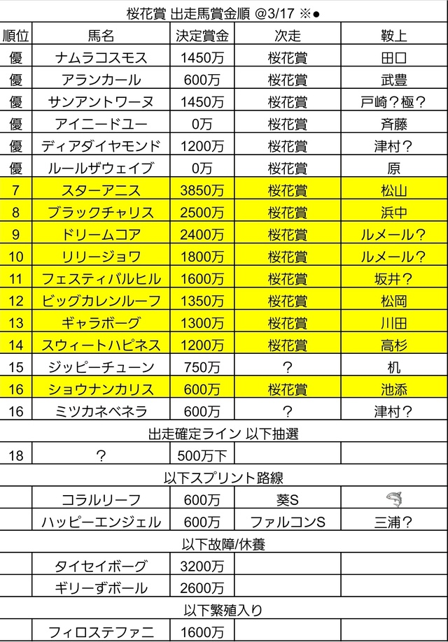 ってかこれだけ桜花賞メンバー薄くなったなら、我らが🤡さんは1着しか許されない忘れな草賞よりも5着以内ならオークス権利取れる桜花賞に回った方がよかったりして
